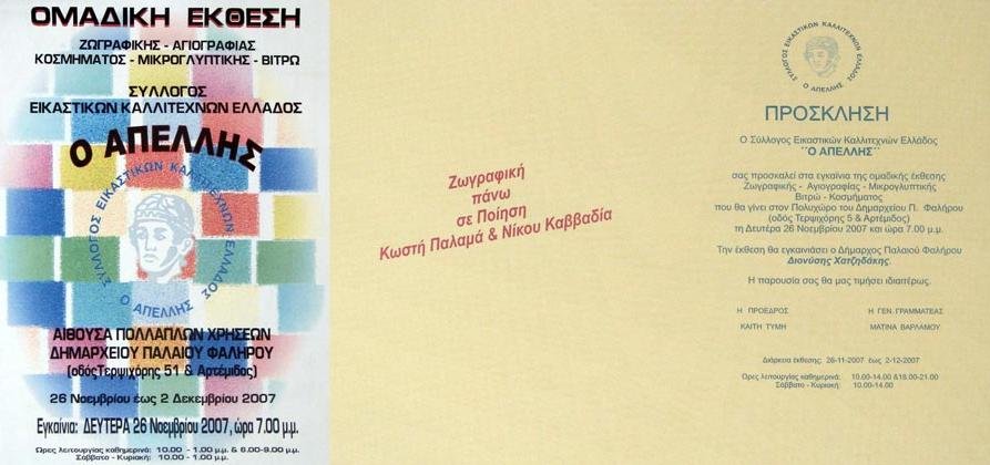 Στις 26/11/2007 έγιναν τα εγκαίνια ομαδικής έκθεσης του Συλλόγου Εικαστικών Καλλιτεχνών Ελλάδος "Ο ΑΠΕΛΛΗΣ" με Ζωγραφική – Αγιογραφία – Βιτρώ - Γλυπτική, στην αίθουσα Πολλαπλών Εκδηλώσεων του Δήμου Παλ. Φαλήρου.