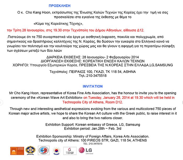 Ο κ. Cho Kang Hoon, εκπρόσωπος της Ένωσης Καλών Τεχνών της Κορέας έχει την τιμή να σας προσκαλέσει στα εγκαίνια της έκθεσης με θέμα το
