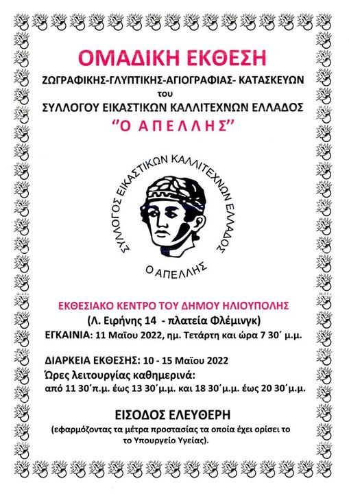 Την 10-15/5/2022 διενεργήθηκε η ομαδική έκθεση του Συλλόγου μας ''Ο ΑΠΕΛΛΗΣ'' στο ωραίο ΕΚΘΕΣΙΑΚΟ ΚΕΝΤΡΟ του ΔΗΜΟΥ ΗΛΙΟΥΠΟΛΗΣ (Λ. Ειρήνης 14 και πλατεία Φλέμινγκ). Ευχαριστούμε τον κ. Γεώργιο Χατζηδάκη, Δήμαρχο Ηλιούπολης, ο οποίος ευγενώς μας παρεχώρησε το εκθεσιακό κέντρο, εγκαινίασε την έκθεση και απηύθυνε χαιρετισμό. Ευχαριστούμε τον κ. Περικλή Καπετανόπουλο ιστορικό ερευνητή και Πρόεδρο του Μουσείου Εθνικής Αντίστασης της Ηλιούπολης, ο οποίος μας τίμησε με την παρουσία του, όπως επίσης τον κ. Στέλιο Μαρούλη Πρόεδρο της Ένωσης Καλλιτεχνών και Λογοτεχνών Ηλιούπολης ''Το Εργαστήρι''. Μας τίμησε με την παρουσία του ο κ. Ανδρέας Αθανασίου θεολόγος, Πολιτικός Επιστήμων, Οικονομολόγος, πρώην Δημοτικός Σύμβουλος Δήμου Ηλιούπολης, ο οποίος απηύθυνε χαιρετισμό.