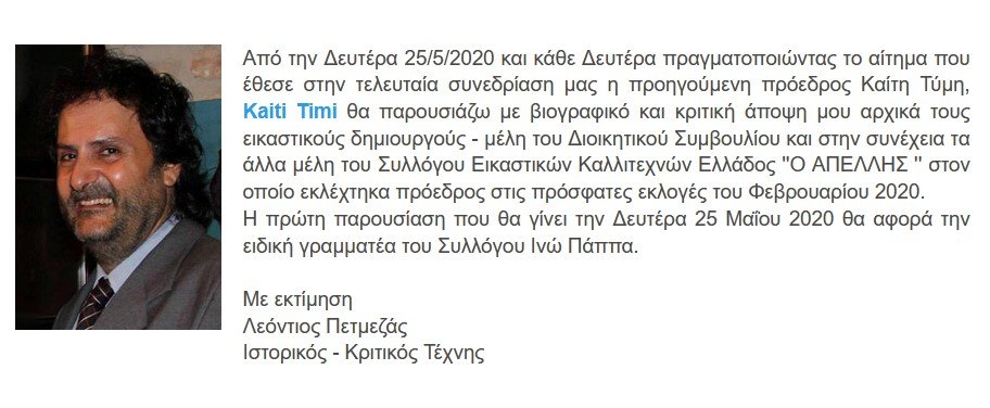 Από την Δευτέρα 25/5/2020 και κάθε Δευτέρα πραγματοποιώντας το αίτημα που έθεσε στην τελευταία συνεδρίαση μας η προηγούμενη πρόεδρος Καίτη Τύμη, Kaiti Timi θα παρουσιάζω με βιογραφικό και κριτική άποψη μου αρχικά τους εικαστικούς δημιουργούς - μέλη του Διοικητικού Συμβουλίου και στην συνέχεια τα άλλα μέλη του Συλλόγου Εικαστικών Καλλιτεχνών Ελλάδος ''Ο ΑΠΕΛΛΗΣ '' στον οποίο εκλέχτηκα πρόεδρος στις πρόσφατες εκλογές του Φεβρουαρίου 2020.